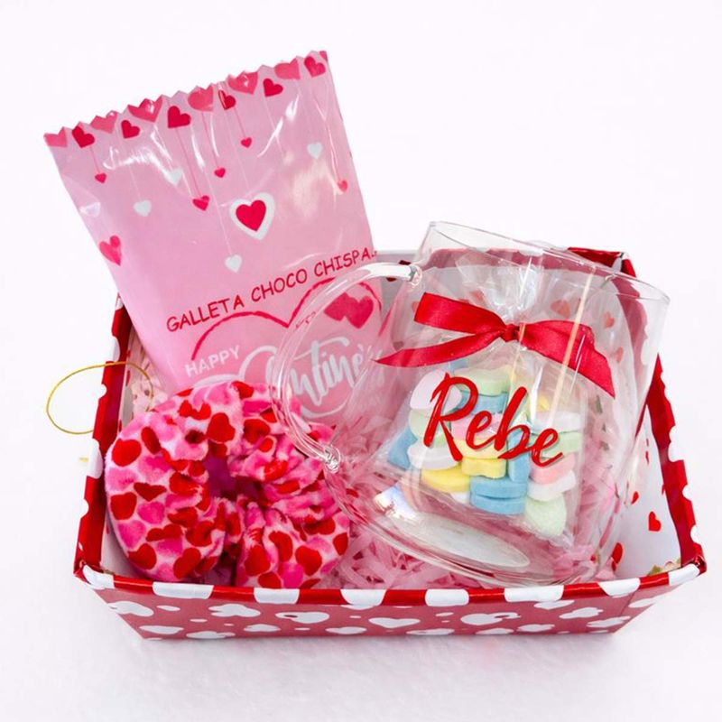 Caja de regalo incluyendo taza personalizada, dulces en forma de corazón, galleta chocochispa, cola de pelo.