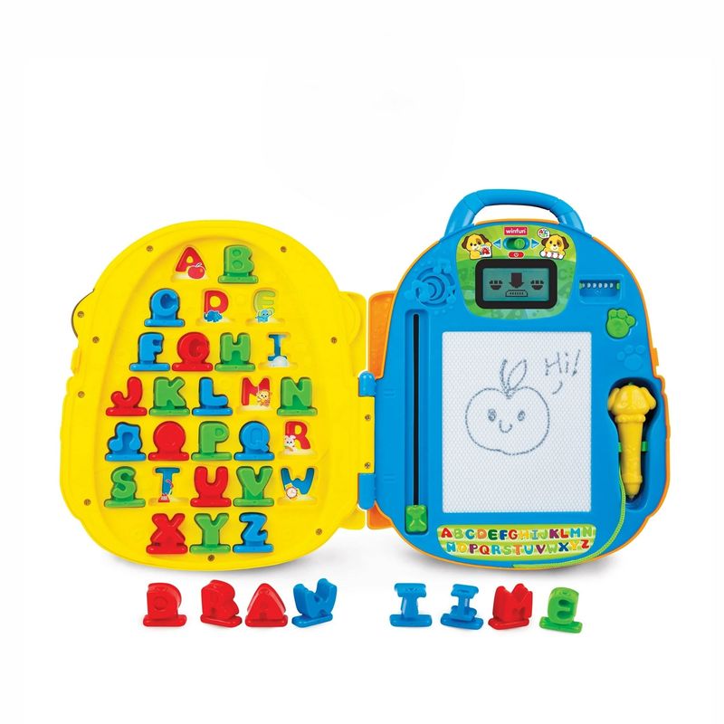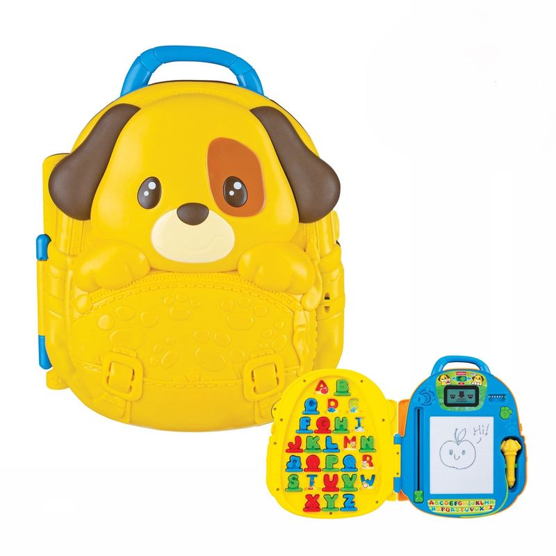 Esta encantadora mochila en forma de cachorro es ideal para el aprendizaje temprano de la alfabetización. Ayuda a enseñar letras, palabras y ortografía a través de divertidos juegos de búsqueda y exploración. Inserta el mosaico de letras en la ranura para escuchar el sonido y ver la animación en su pantalla LCD. Incluye instrucciones paso a paso para escribir letras y un botón interactivo para añadir diversión al aprendizaje. Con frases, sonidos y melodías, además de una pizarra magnética con bolígrafo, es perfecta para llevar la diversión educativa a todas partes.