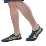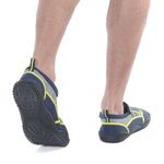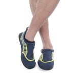 Lavable a máquina y también este material tiene un secado rápido al aire, cuenta con una lengüeta de talón y autocierre con malla de velcro para un ajuste fácil y seguro. Está elaborado en colores azul oscuro, malla transpirable en gris y detalles en verde neón, con su distintivo de la marca en sus laterales.